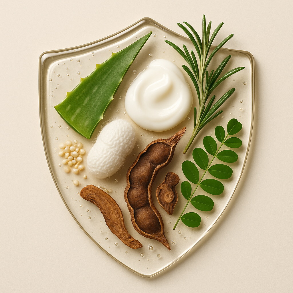 A proprietary blend of 6 Ayurvedic and botanical extracts like aloe, rosemary, coconut milk, silk proteins, quinoa, and tamarind root extract create a healing ecosystem for scalp and hair. While Amino Peptides rebuild internally, these herbal actives: