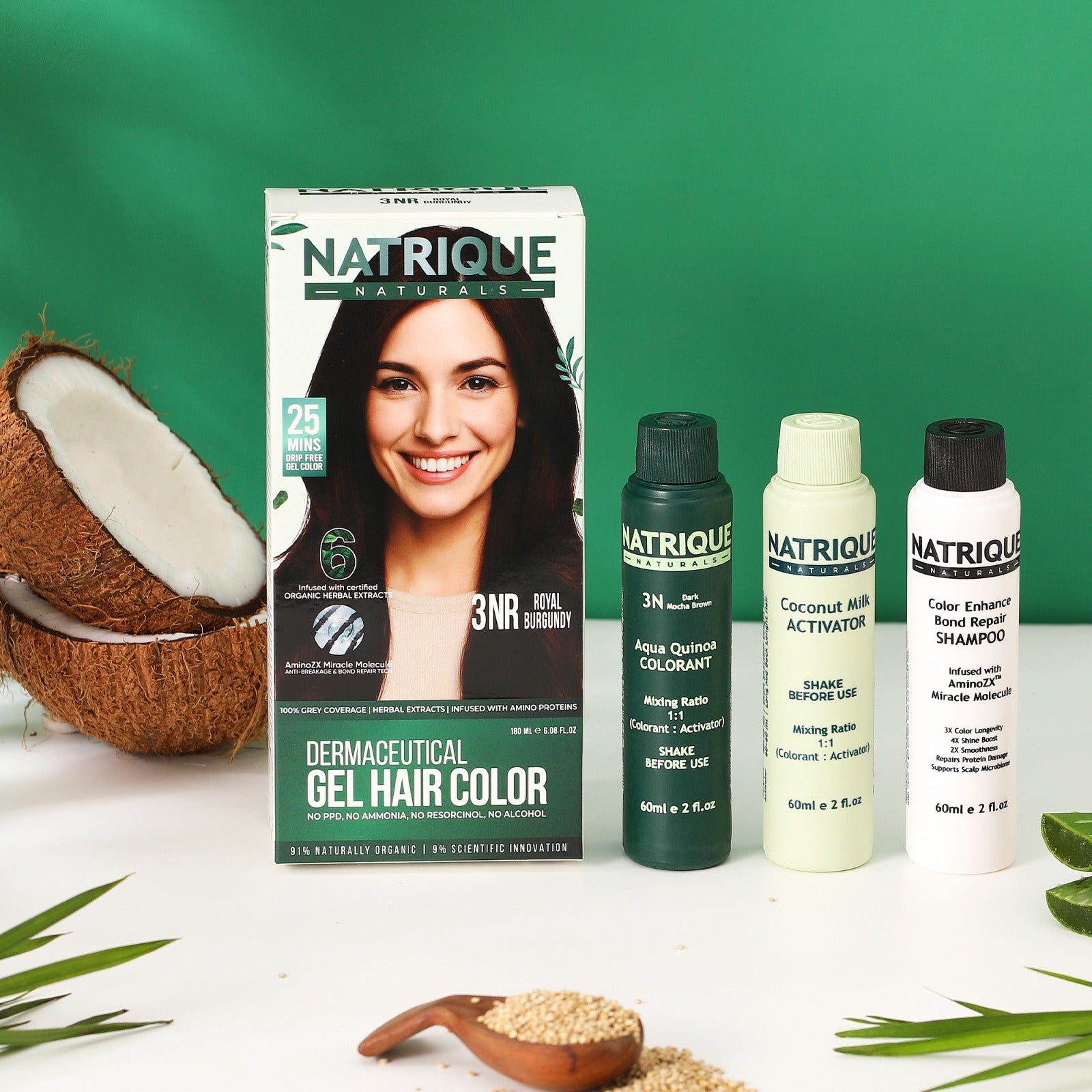 Step into the future of hair coloring with NATRIQUE Naturals. A luxurious, pH-balanced gel that delivers salon-rich, long-lasting color while it repairs. Our proprietary AminoZX™ Miracle Molecule—a next-gen amino-peptide complex along with 6 herbal extracts—penetrates deep to help restore broken bonds and strengthen the hair’s inner structure as you color.