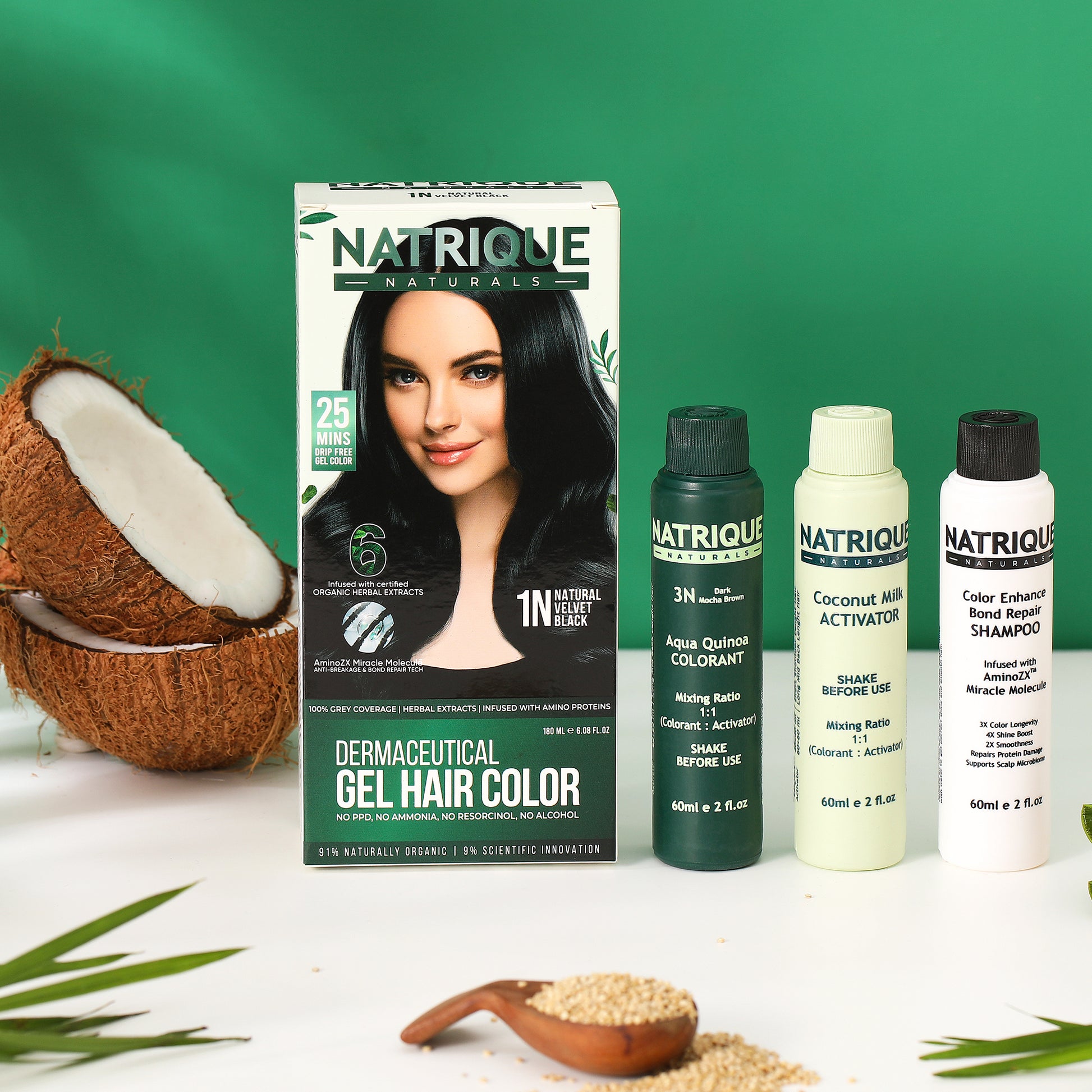 Step into the future of hair coloring with NATRIQUE Naturals — A luxurious, pH-balanced gel that delivers salon-rich, long-lasting color while it repairs. Our proprietary AminoZX™ Miracle Molecule—a next-gen amino-peptide complex along with 6 herbal extracts—penetrates deep to help restore broken bonds and strengthen the hair’s inner structure as you color. The Coconut Milk Activator and Aqua Quinoa Colorant create a smooth, drip-free gel for even coverage and vibrant payoff in just 25 minutes.
